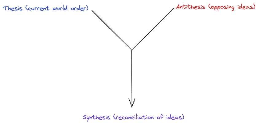 Hegel’s dialectical reasoning states that history progresses through a series of conflicts and resolutions. According to Hegel, the current world order can be viewed as the thesis. New, opposing ideas that are in conflict with the current world order are the antithesis. The synthesis is the new world order that is formed after the conflict between the thesis and antithesis is resolved.