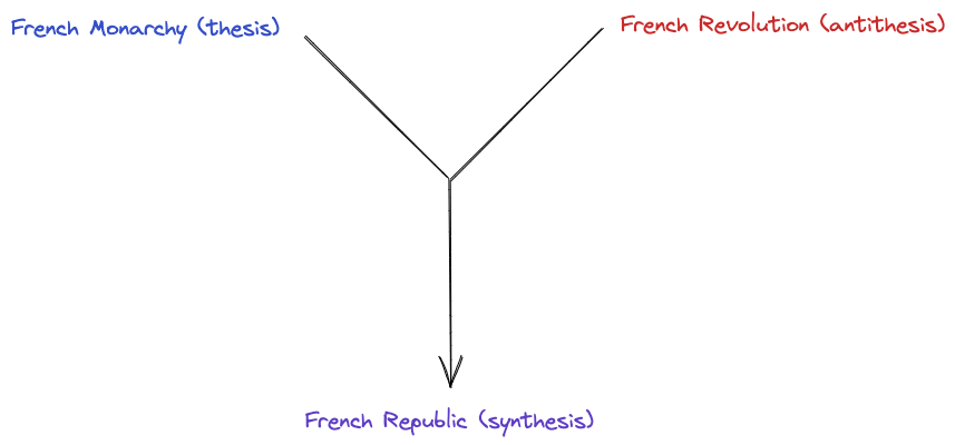 Hegel used the example of the French Revolution to explain his idea. The French Monarchy was the thesis, the current world order. The drastic opposite of the French Monarchy was the French Revolution, the antithesis. The synthesis was the new world order that was formed after the French Revolution, which was the French Republic.