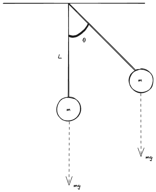 \[r \times F = rF \sin \theta\]But what is the “restoring” force acting on the pendulum? Well, in this case, we only have gravity acting on the pendulum, so that must be our restoring force. Therefore, we get: